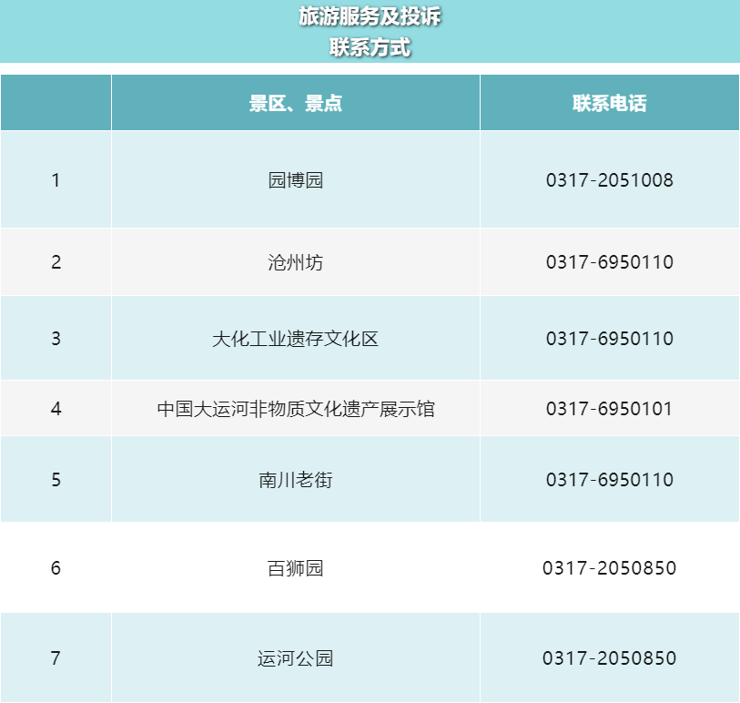 為了更好地服務(wù)大家,保障大家在滄州大運(yùn)河的游玩體驗(yàn),現(xiàn)公布以下相關(guān)地點(diǎn)的旅游服務(wù)及投訴聯(lián)系方式,在這里您可以反饋各類問題和意見,若您在游玩過程中遇到任何不盡如人意之處,請及時(shí)聯(lián)系我們。