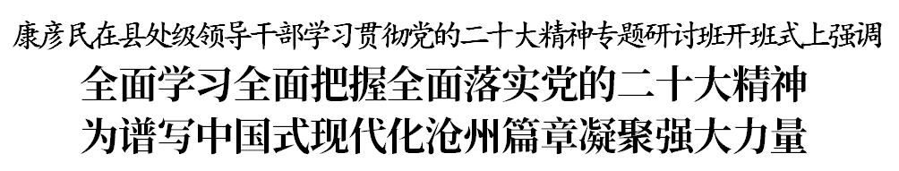 2月14日,縣處級(jí)領(lǐng)導(dǎo)干部學(xué)習(xí)貫徹黨的二十大精神專題研討班開班。市委書記康彥民作專題輔導(dǎo)報(bào)告??祻┟駨?qiáng)調(diào),要堅(jiān)持以習(xí)近平新時(shí)代中國(guó)特色社會(huì)主義思想為指導(dǎo),深入學(xué)習(xí)宣傳貫徹黨的二十大精神和省委十屆二次、三次全會(huì)精神,切實(shí)做到學(xué)有所悟、學(xué)以致用、學(xué)有所成,進(jìn)一步解放思想、奮發(fā)進(jìn)取,為加快建設(shè)沿海經(jīng)濟(jì)強(qiáng)市、譜寫中國(guó)式現(xiàn)代化滄州篇章凝聚強(qiáng)大力量。市委副書記、市長(zhǎng)向輝主持。市人大常委會(huì)主任宋有洪、市政協(xié)主席王曉燕出席。