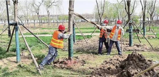 昨天上午,在百獅園植樹現(xiàn)場(chǎng),一派忙碌景象。參加植樹的工人們鏟土、培土圍堰、提水澆灌,接連種下海棠、油松等樹木。