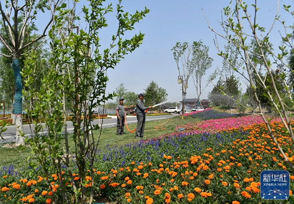 ↑5月12日,工人在滄州園博園內(nèi)養(yǎng)護(hù)花卉。